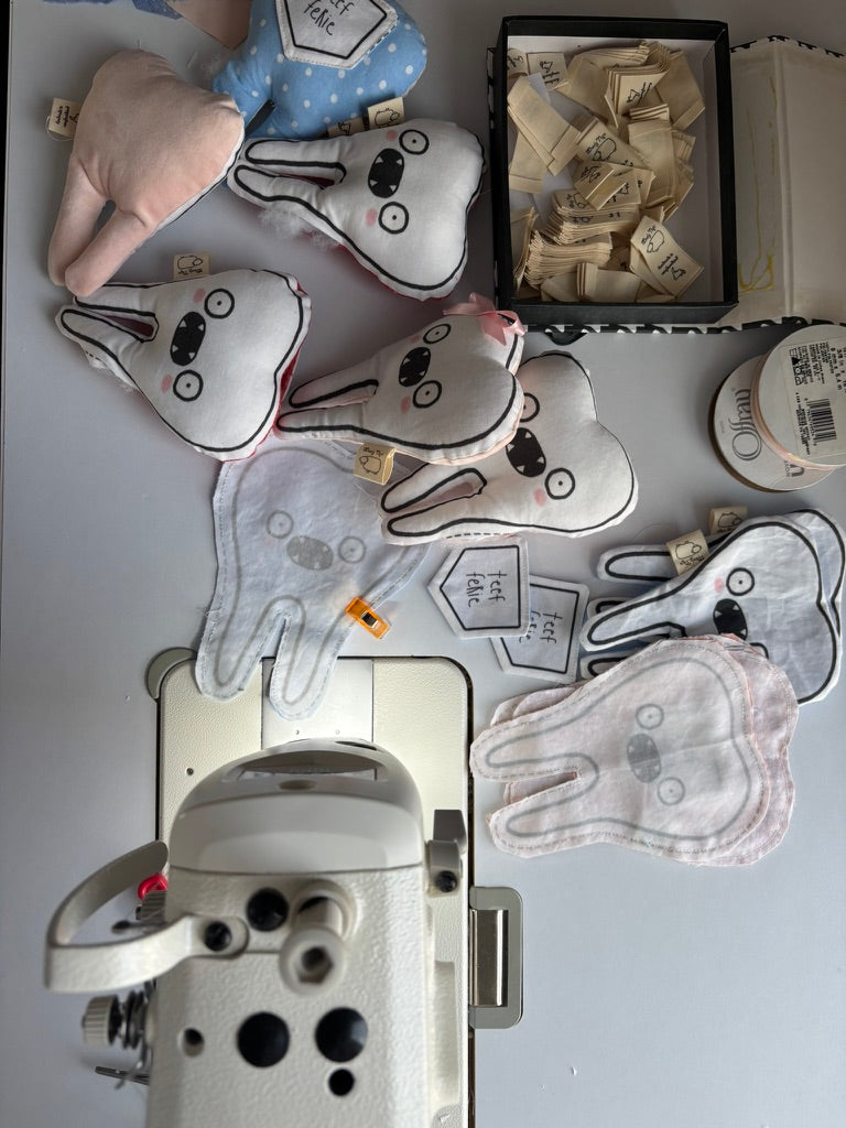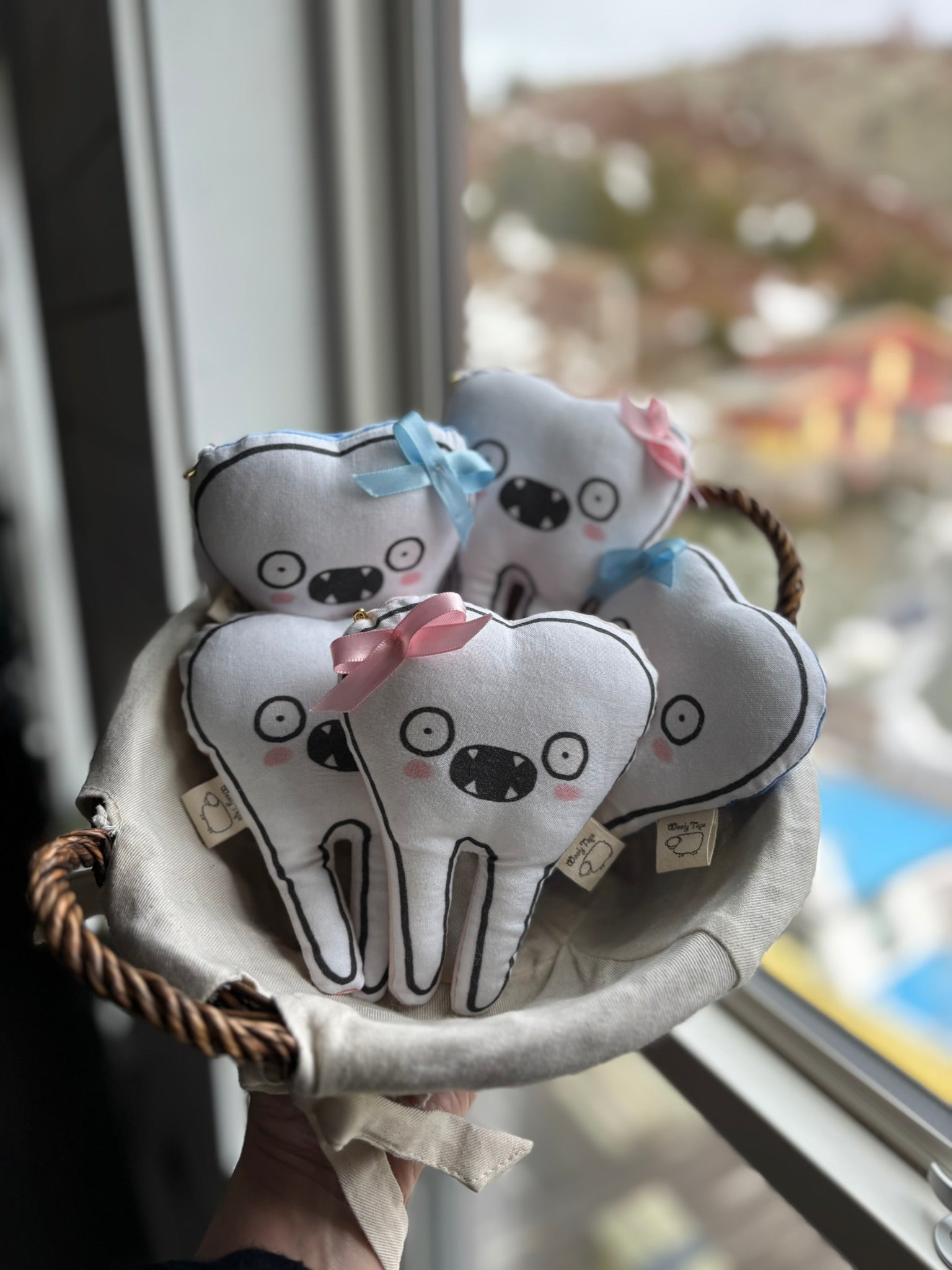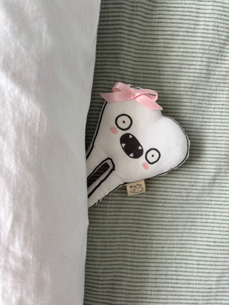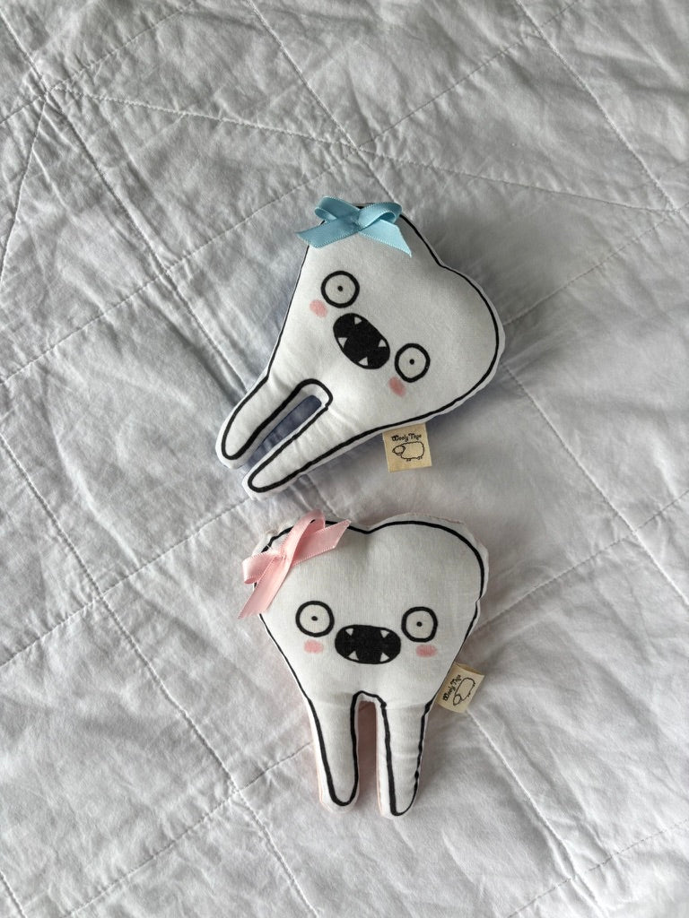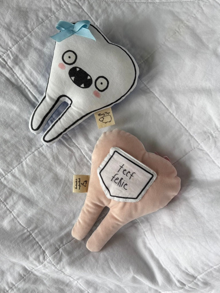 Our 'teef ferie' pillows are handcrafted from our custom illustrated fabric. Children can tuck their lost tooth in the tiny back pocket ensuring their missing tooth is safe and easy for the 'teef ferie' to find. These uniquely crafted pillows make memorable birthday and special occasion gifts.