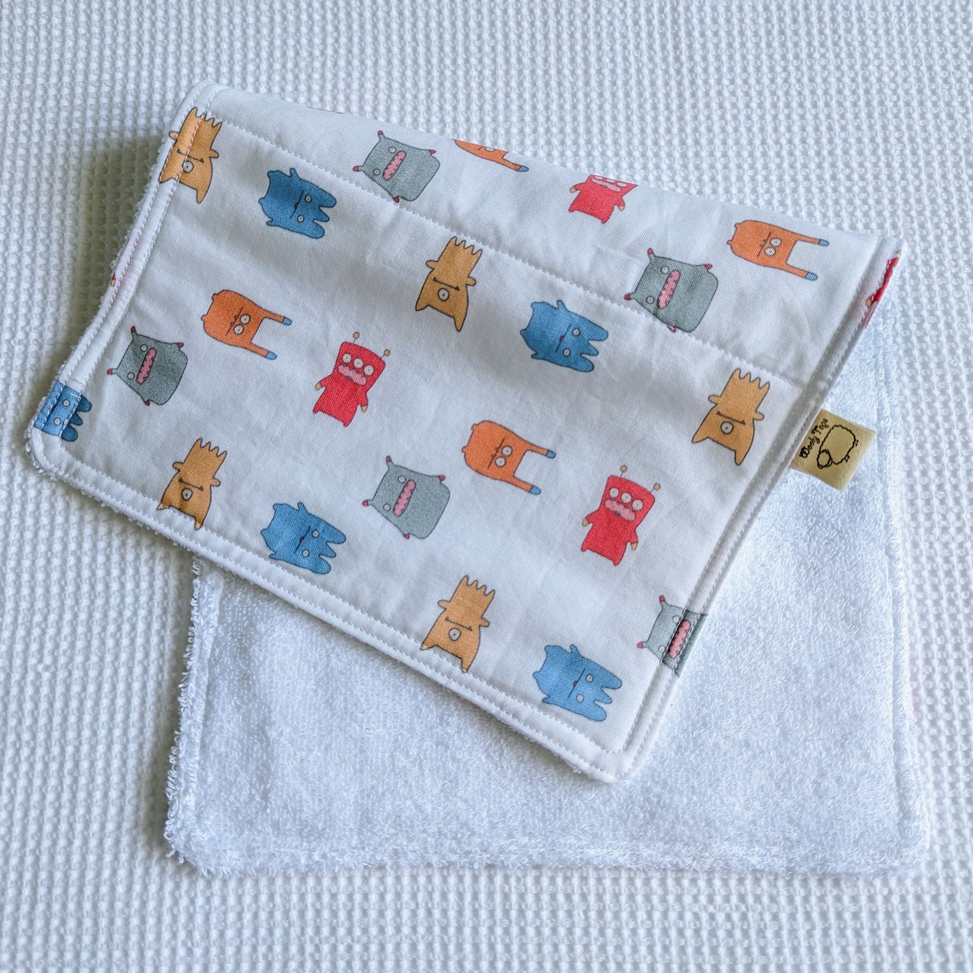 Our soft and absorbent burp cloths are available in any three of our signature prints with a white bamboo/cotton terry. These can be used for wiping drool or as a comfy little drip cloth for nursing a baby. Babies can also use these as a wee cuddle blankie to hold in their hand.