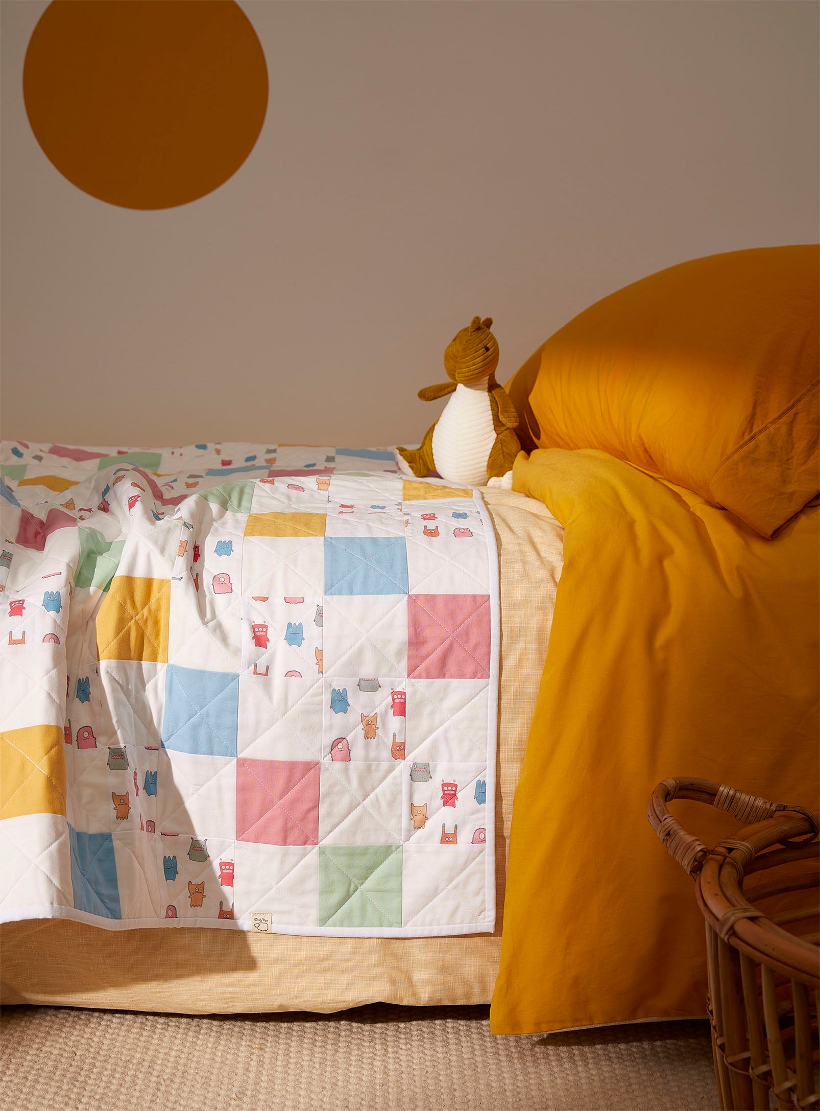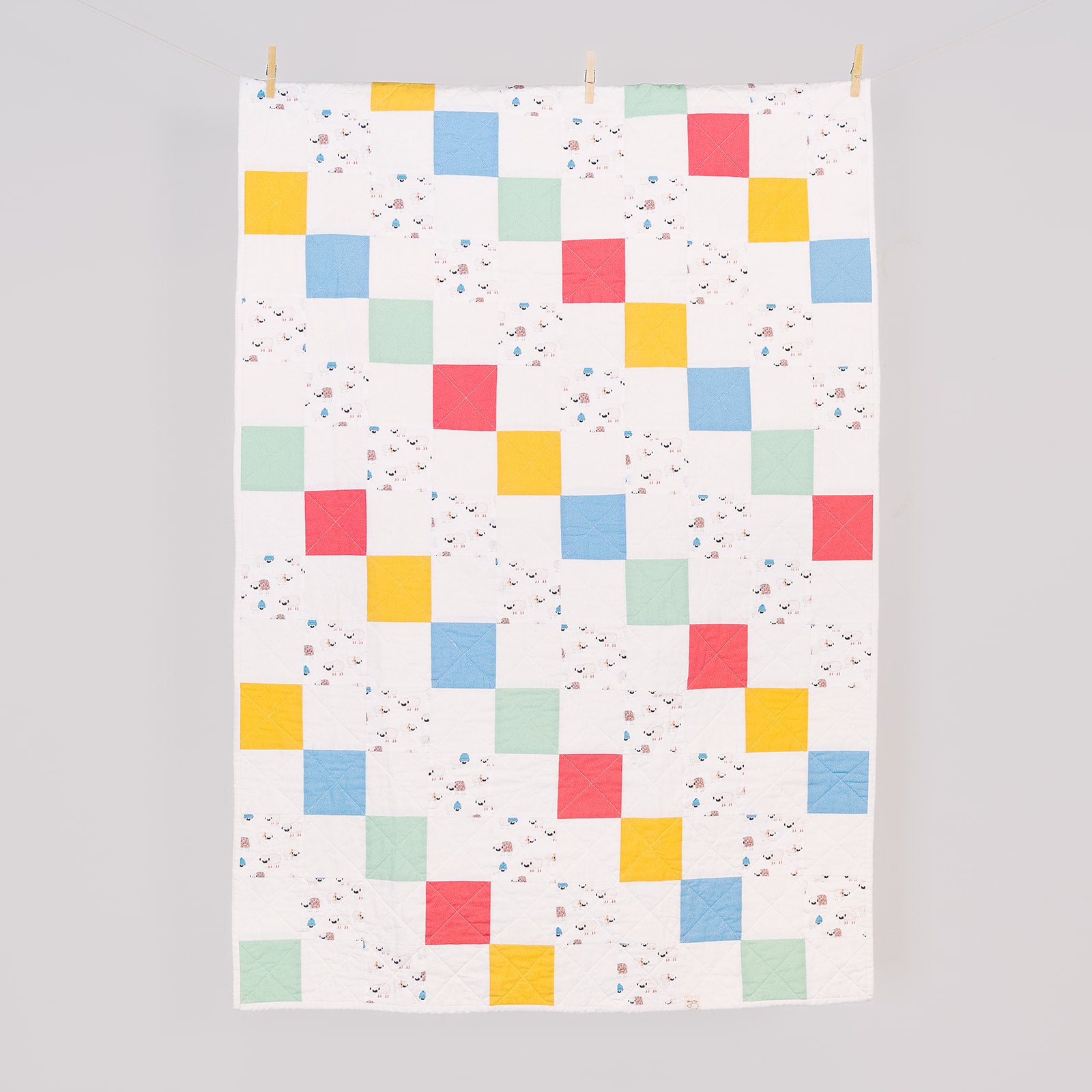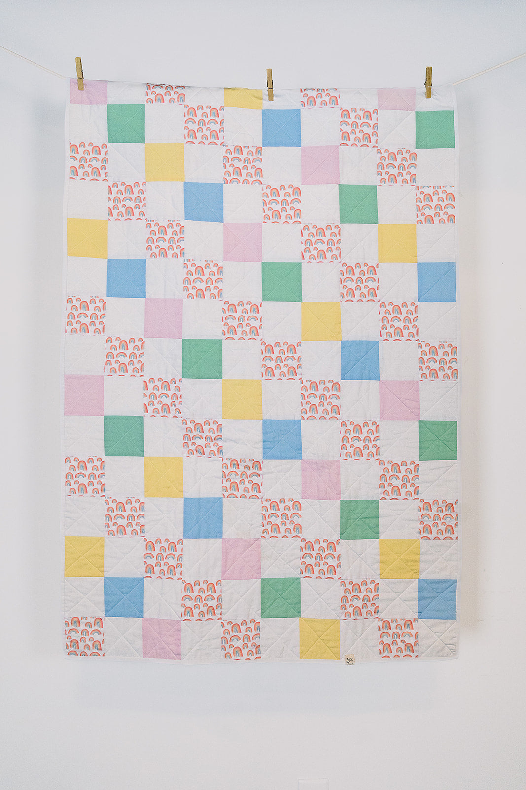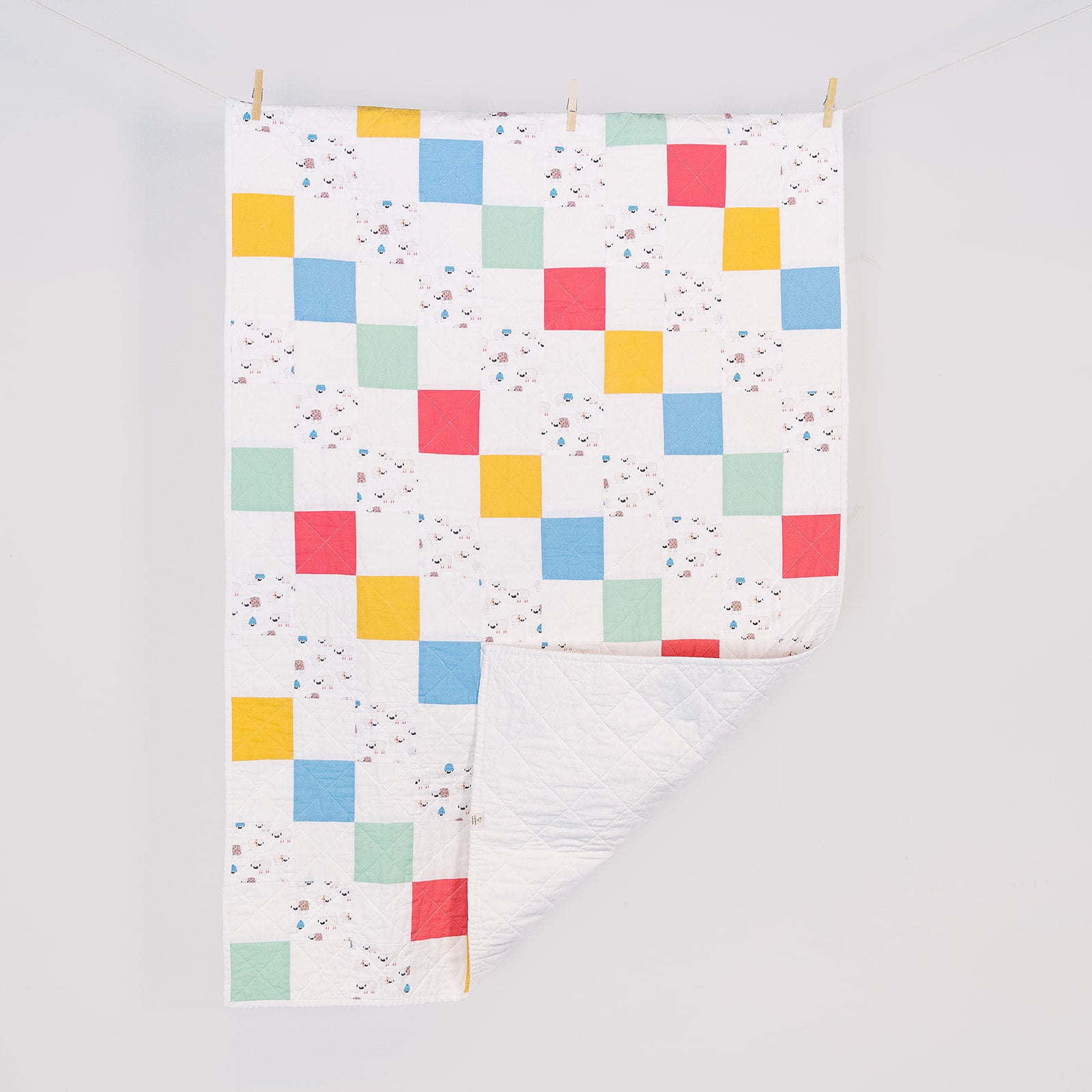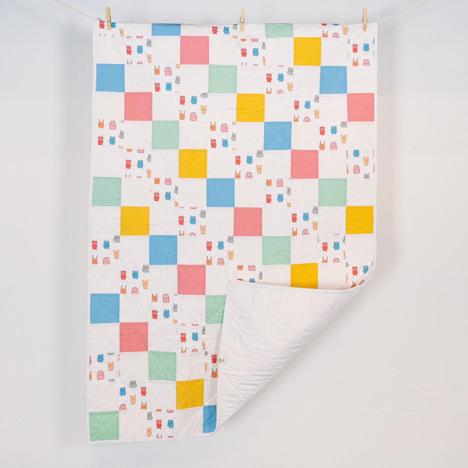 Our Kindred Quilts feature one of our signature prints on 3.5-inch blocks sewn in a pattern with solid-coloured cotton squares. The quilt backing is crisp white cotton with a white hand-stitched, double-layer binding to ensure lasting wear. These quilts are a perfect size for little ones to curl up in, to use as a play mat, or to keep extra cozy in their beds at night. Each quilt is individually crafted and made to last for many years of comfort and memories.