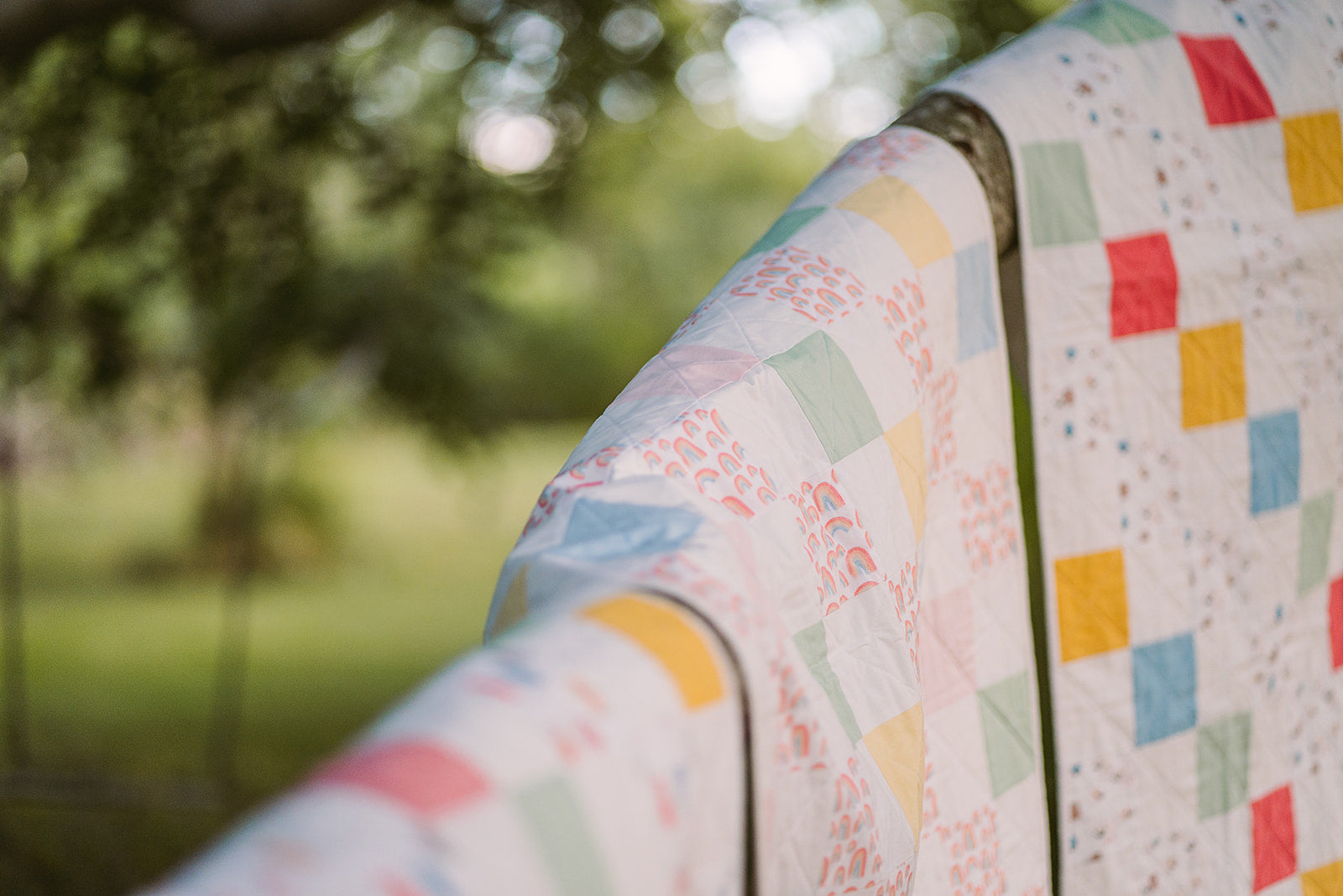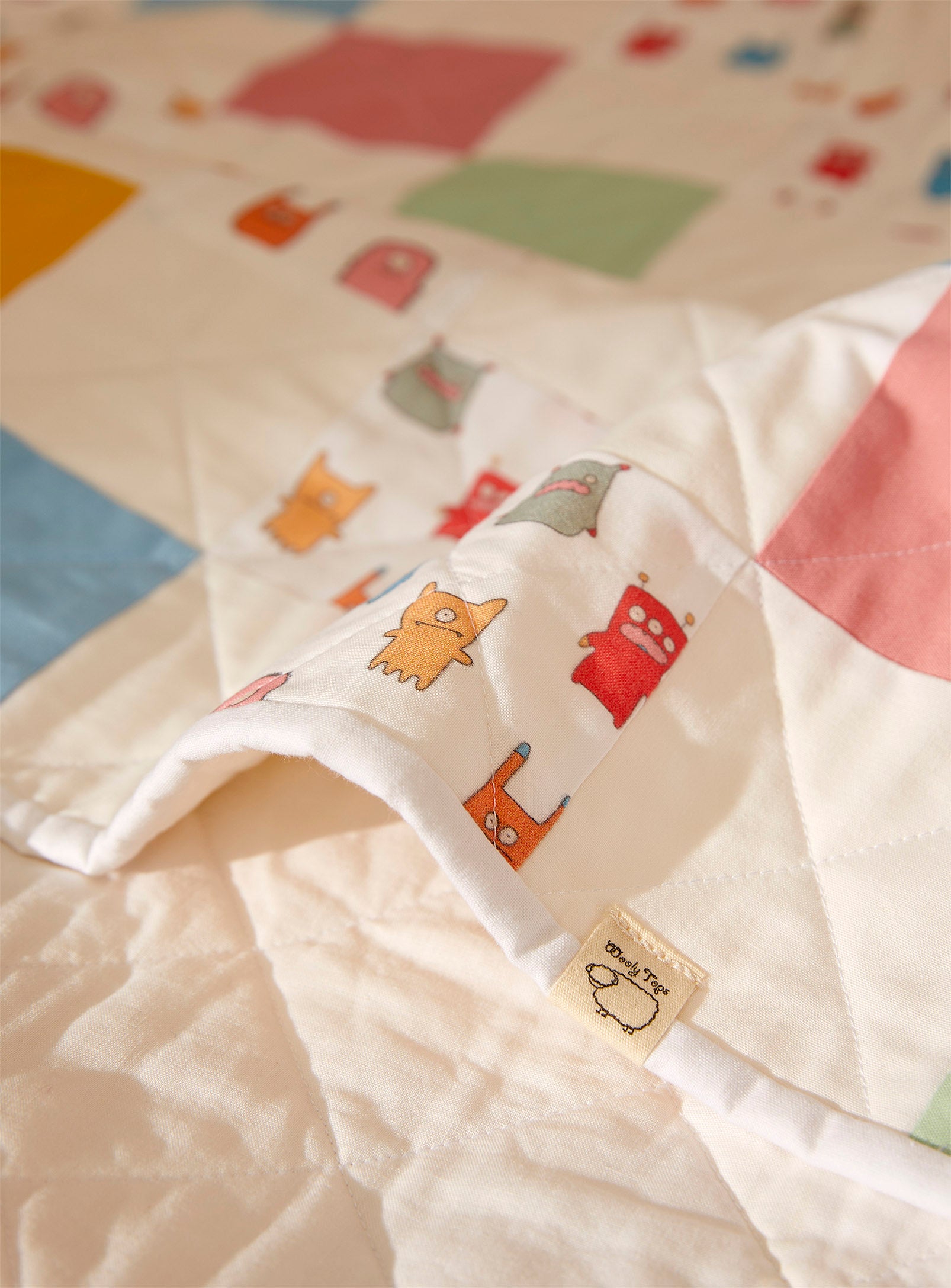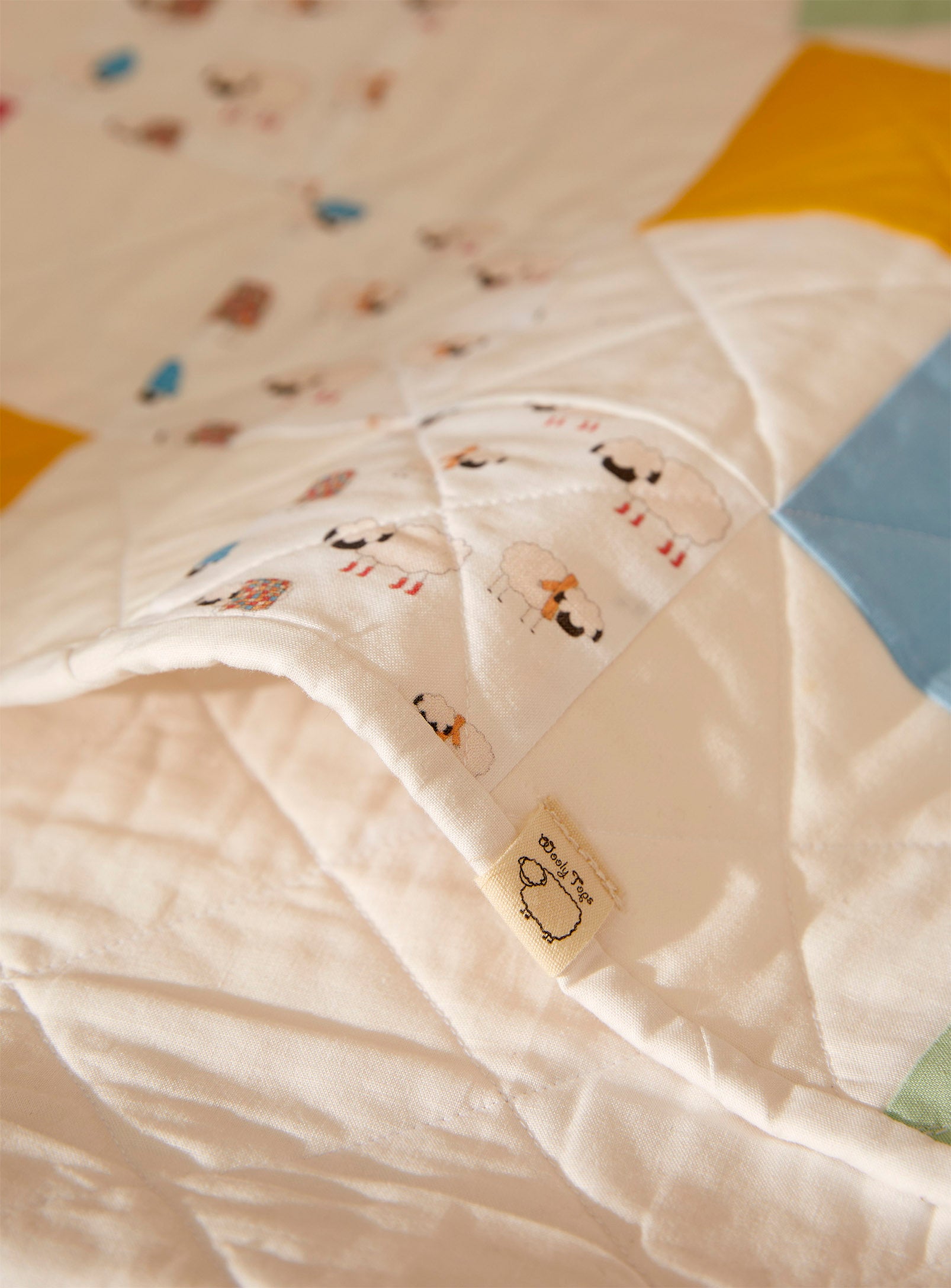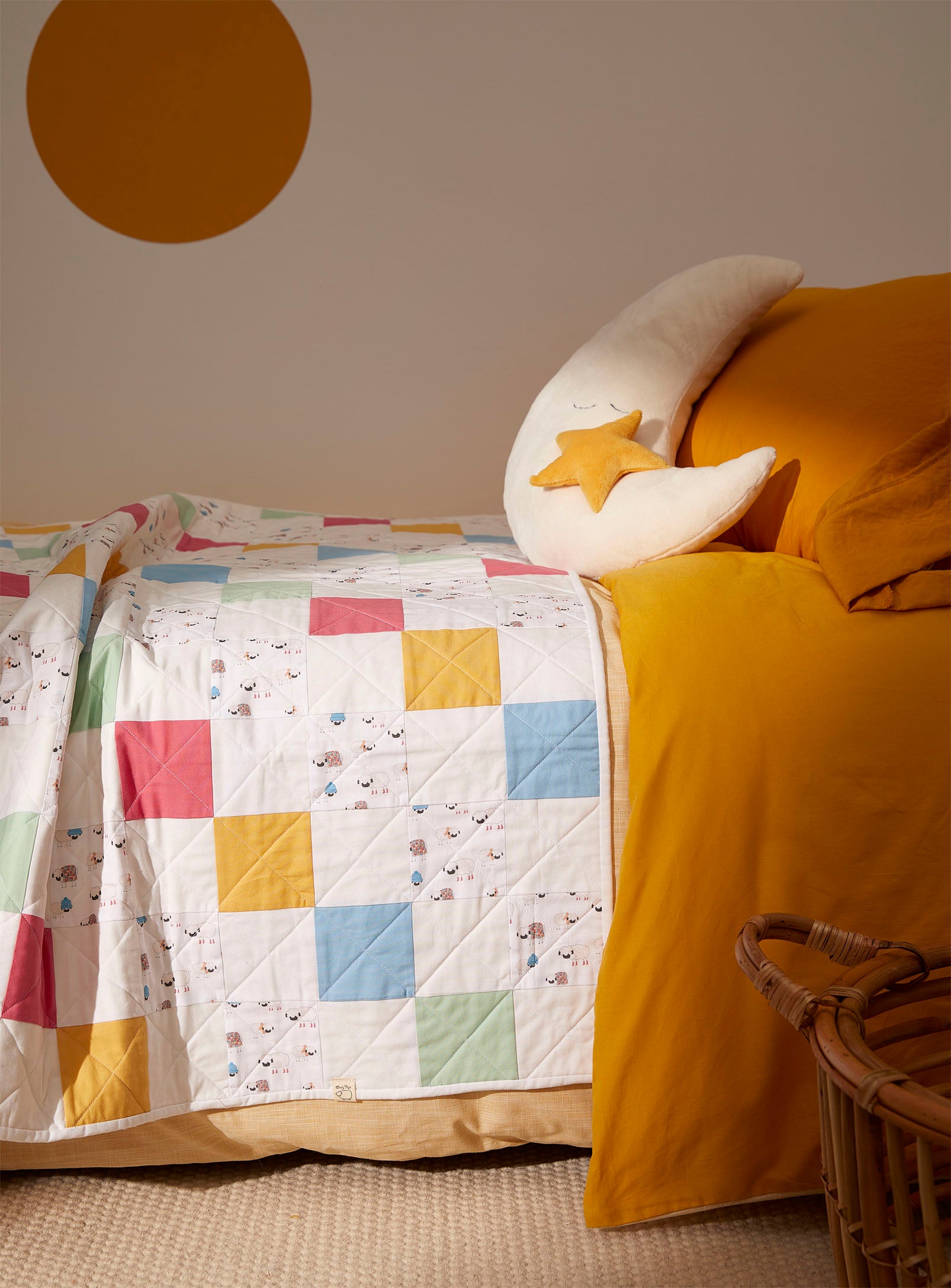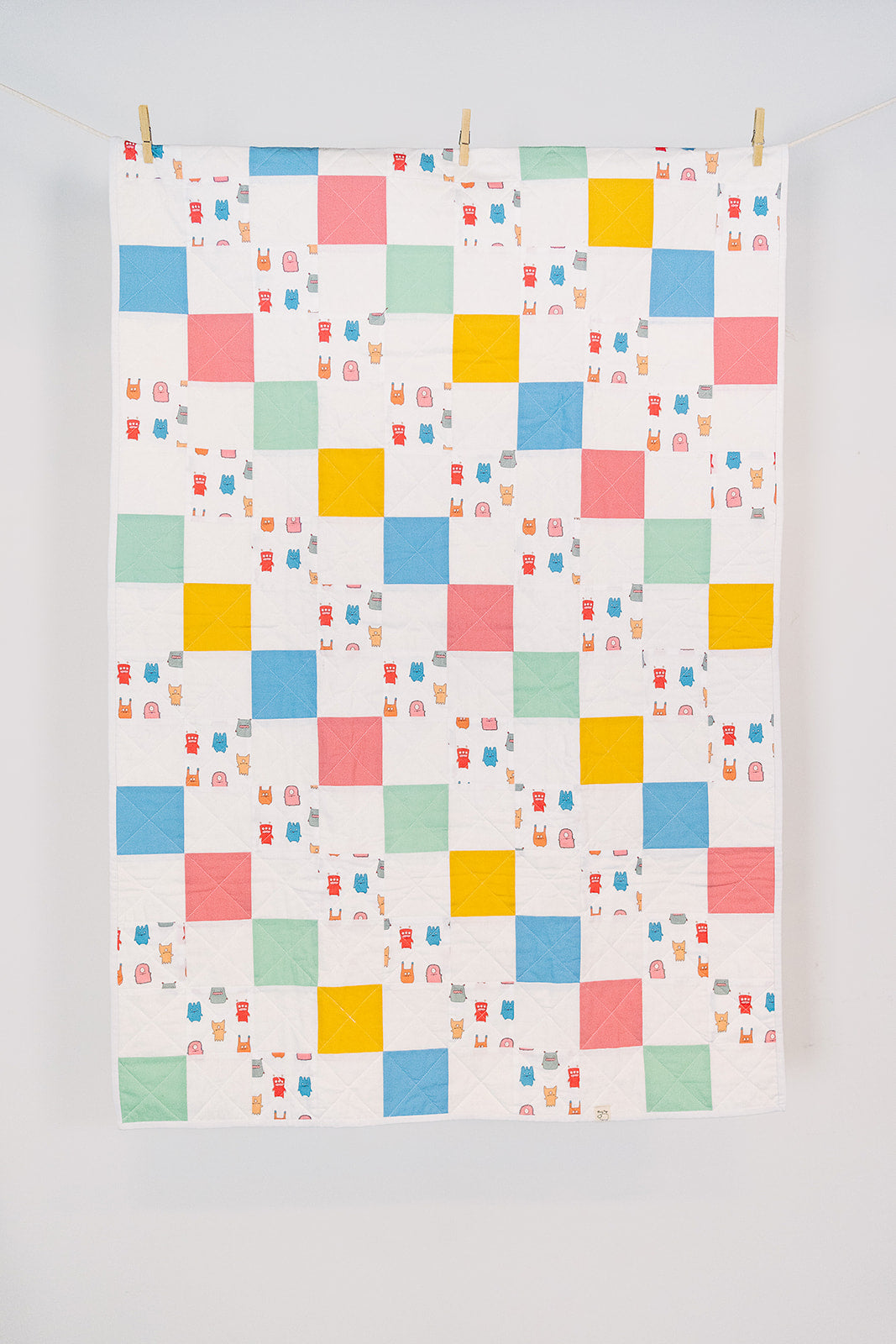 Our Kindred Quilts feature one of our signature prints on 3.5-inch blocks sewn in a pattern with solid-coloured cotton squares. The quilt backing is crisp white cotton with a white hand-stitched, double-layer binding to ensure lasting wear. These quilts are a perfect size for little ones to curl up in, to use as a play mat, or to keep extra cozy in their beds at night. Each quilt is individually crafted and made to last for many years of comfort and memories.