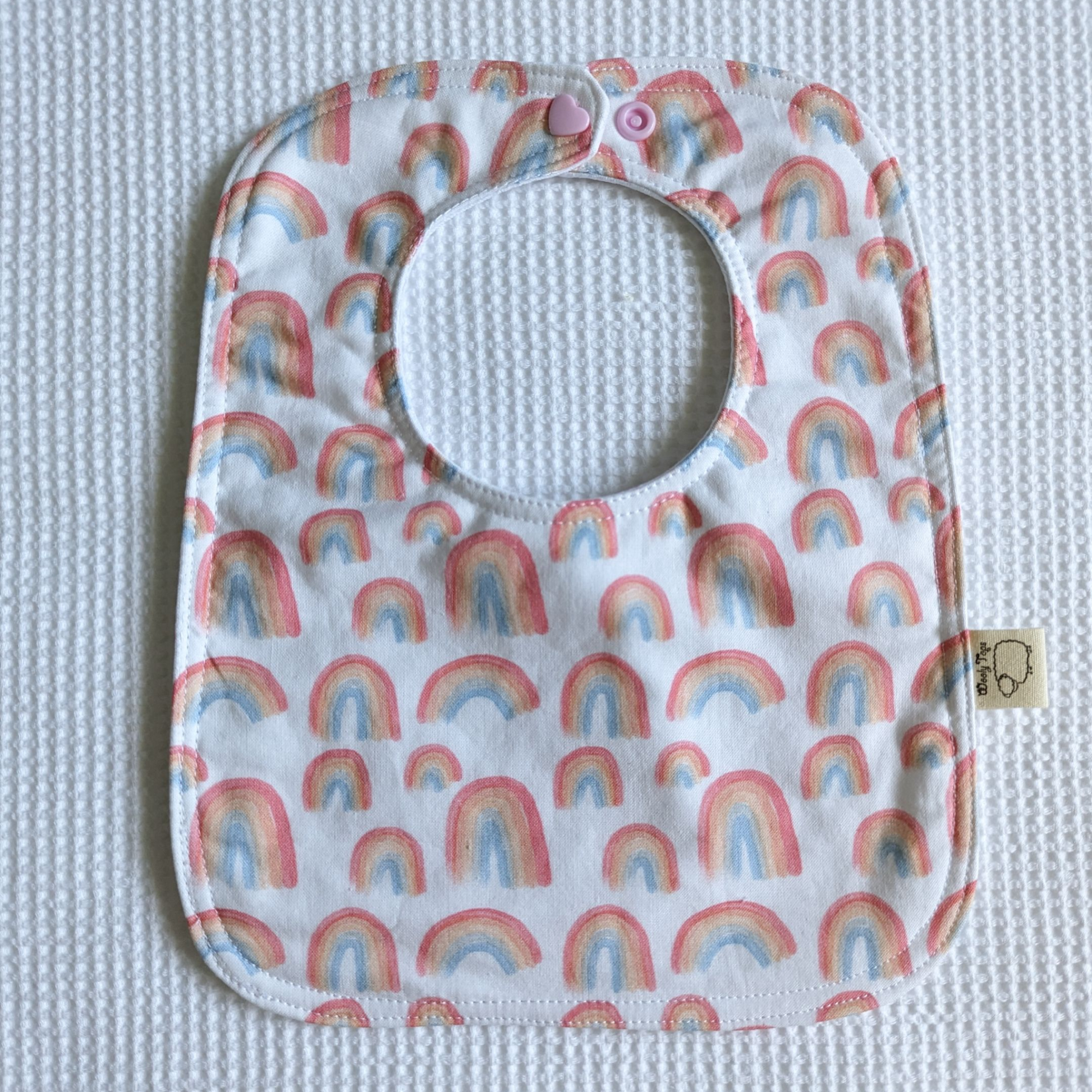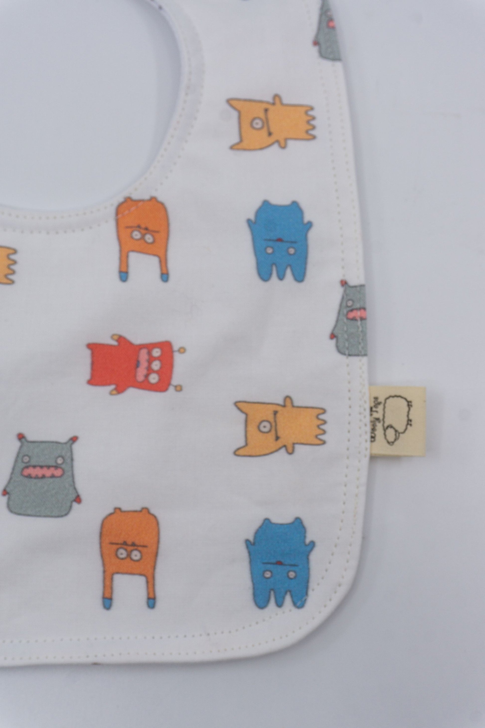 - Baby bib with our signature cotton printed front and white waterproof back