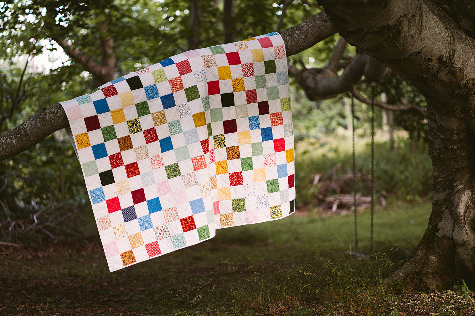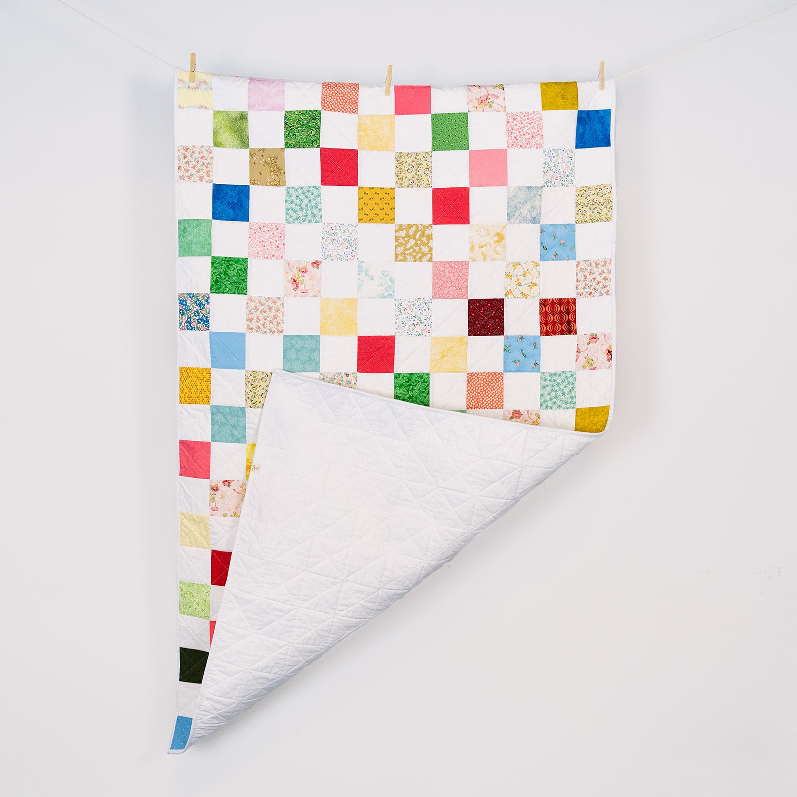 The Willum Quilt, Medium Square is sewn with 4-inch squares, showing as 3.5 inches in the finished quilt due to the 1/4-inch seam allowance. The quilt backing is a crisp white cotton with a white hand-stitched, double-layer binding to ensure lasting wear.