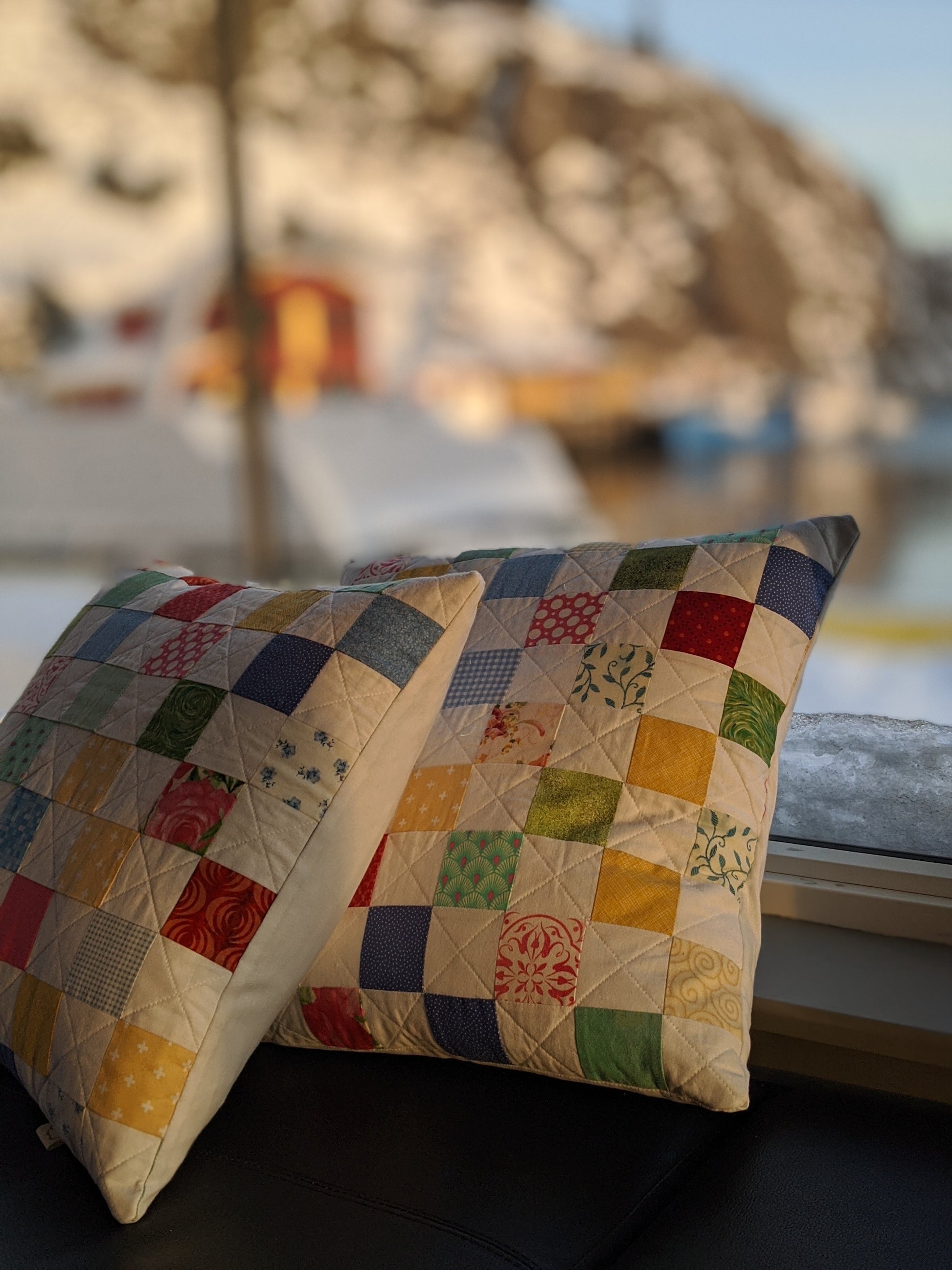 Our Willum Cushions are made with pre-washed cotton fabrics and a cotton/bamboo batting. Colourful squares are alternately sewn to white squares in a random pattern and quilted together. The cushion front is lined for easy washing.